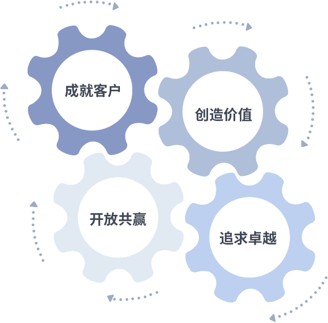 成就客户是一切决策的出发点,,创造价值是衡量所有工作的标准,,,,追求卓越是我们做事做人的态度,,,,开放共赢是我们的格局也是最终的结果。。。价值观的齿轮环环相扣,,,推动着组织里的每个人不断向前。。。。