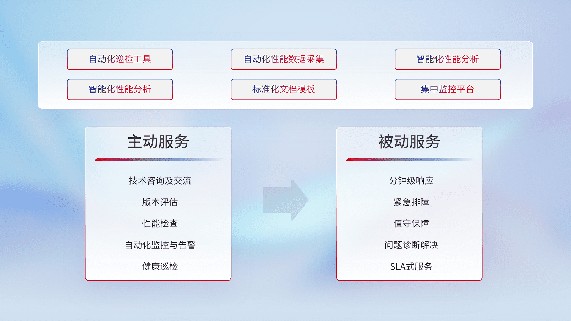 智能化工具和标准化文档,,,保障服务质量,,,提供主动服务(包含技术咨询、、版本评估、、性能检查、、、、自动化监控与告警、、、、健康巡检)和被动服务包含(分钟级响应、、、、紧急排障、、、、值守保障、、问题诊断解决、、SLA服务)。。